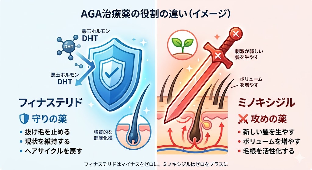 | AGA治療での役割 | 🛡️ 守り(進行遅延・予防) | ⚔️ 攻め(発毛促進) |