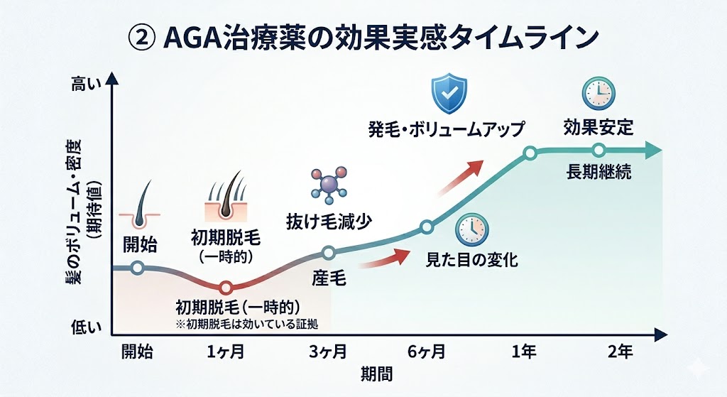 使用開始から2週間〜1ヶ月頃に、一時的に抜け毛が増える現象(初期脱毛)が起こることがあります。これは、乱れていたヘアサイクルがリセットされ、古い髪が新しい太い髪に押し出されている「薬が効き始めているサイン」です。ここで驚いて薬をやめてしまわないことが非常に重要です。