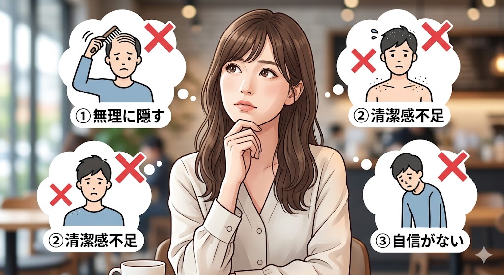 この見出しでは、女性が思わず敬遠してしまう「NGな薄毛の状態」と、その境界線を客観的に整理します。 知らず知らずのうちにマイナス評価を受けていないか、ご自身の現状と照らし合わせながら確認してみてください。