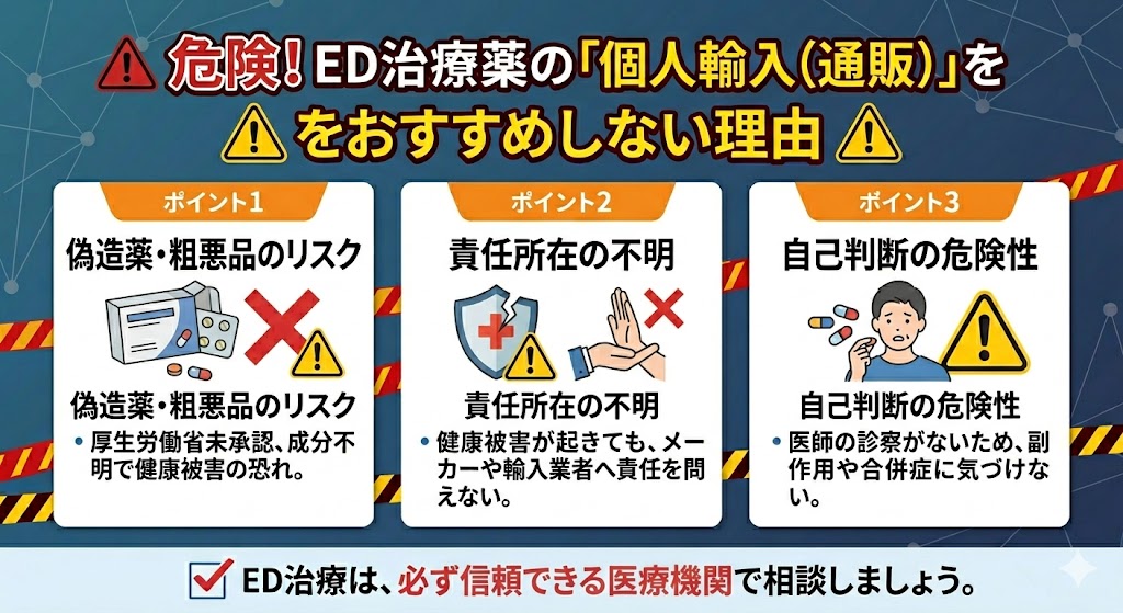 ネットで検索すると出てくる「格安の個人輸入代行サイト」は、一見便利でお得に見えます。しかし、結論から言うと、医療機関を通さないED薬の入手は「命に関わるギャンブル」です。なぜ安易な利用が危険なのか、その実態を詳しく解説します。