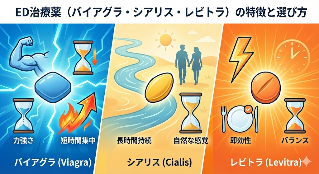 ED治療薬(バイアグラ・シアリス・レビトラ)の特徴と選び方