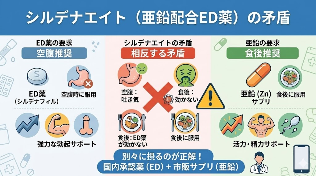 別々に用意することで、「シルデナエイトの矛盾(空腹時に飲みたいED薬 vs 胃が荒れやすい亜鉛)」も解消できます。