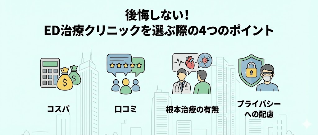 ED治療はデリケートな部位の悩みであり、今後のあなたの自信とライフスタイルに直結する大切な選択です。治療後に「こんなはずじゃなかった」と後悔しないために、以下の4つのポイントを必ずチェックしてクリニックを選びましょう。