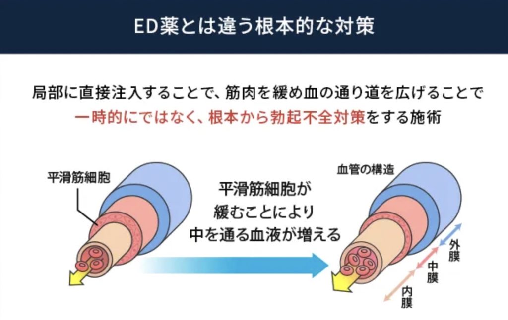 EDの大きな原因の一つに、加齢やストレスによって「陰茎周辺の筋肉(平滑筋)が硬く収縮し、血管を締め付けて血流を阻害している」状態があります。
