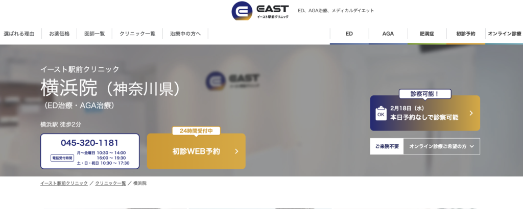 「まずは手軽にED治療薬を試してみたい」「横浜駅の近くですぐに薬だけ処方してほしい」という、スピードと利便性(タイパ)を最優先する方には、イースト駅前クリニック 横浜院が有力な選択肢となります。