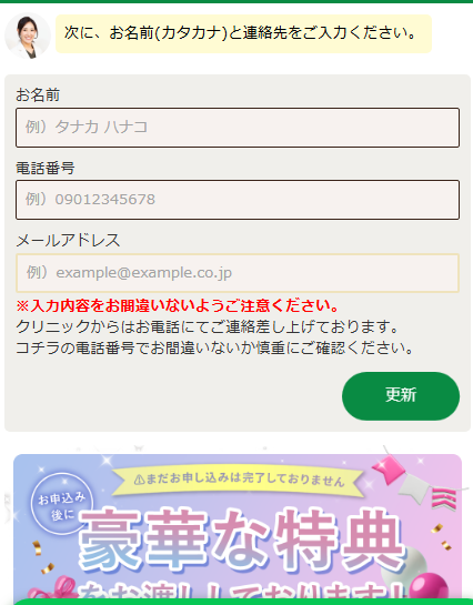 最後に、お名前、電話番号、メールアドレスを入力して個人情報の規約部分をよく読み