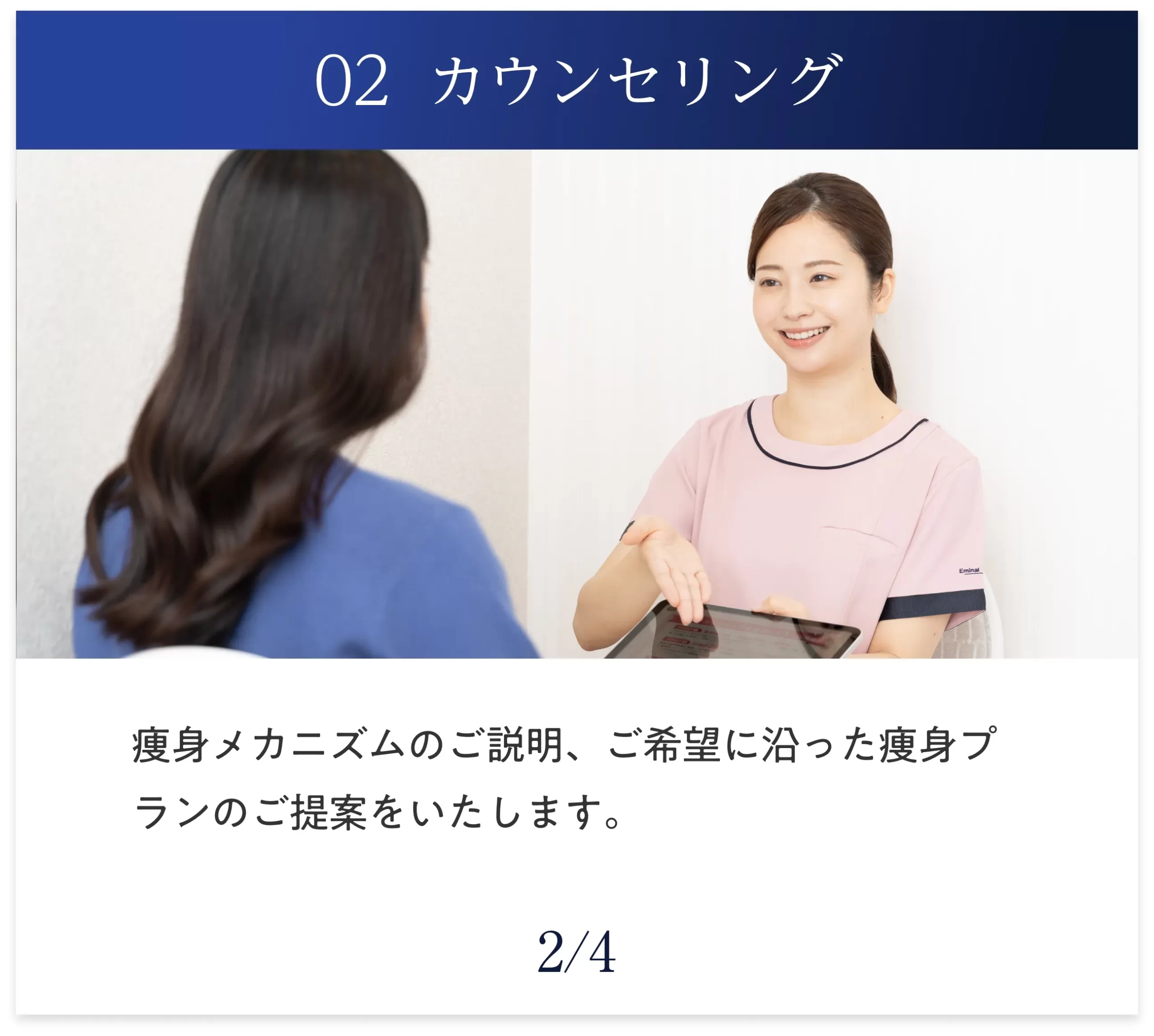 痩身メカニズムの説明、希望にそった痩身プランの提案を受けます。