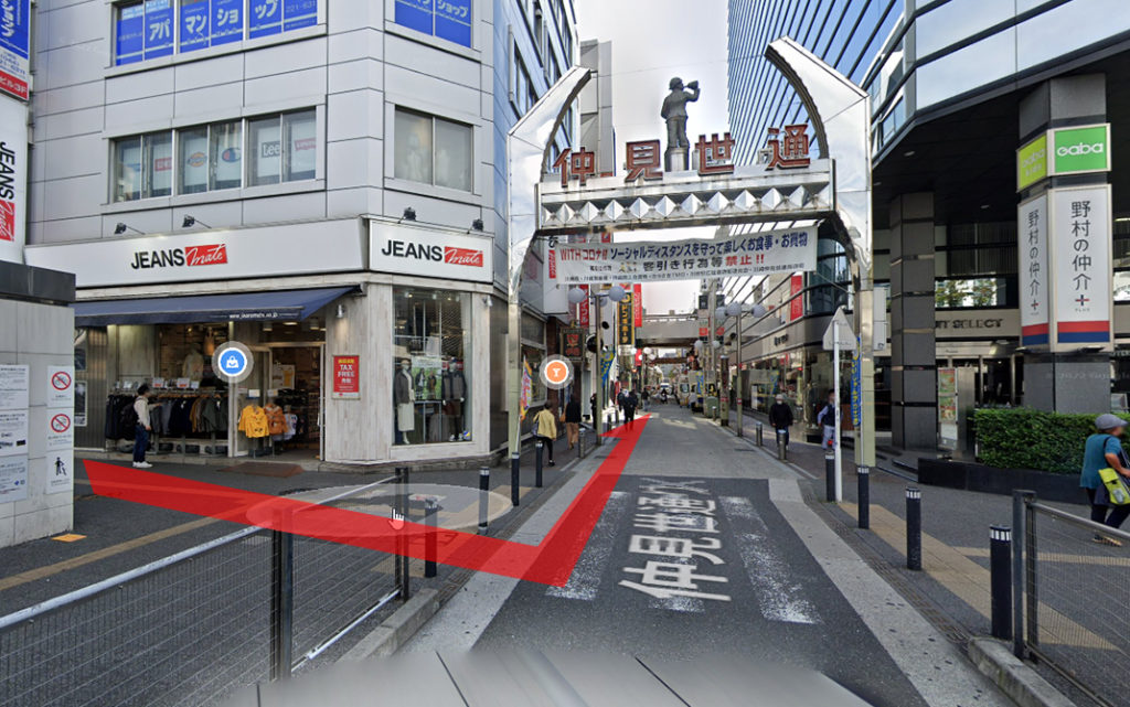 ①川崎地下街アゼリア出口27番を出て、仲見世通りに入ります。