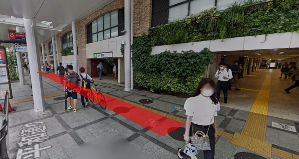 ①JR吉祥寺駅を右に出て、バス停を進みます。