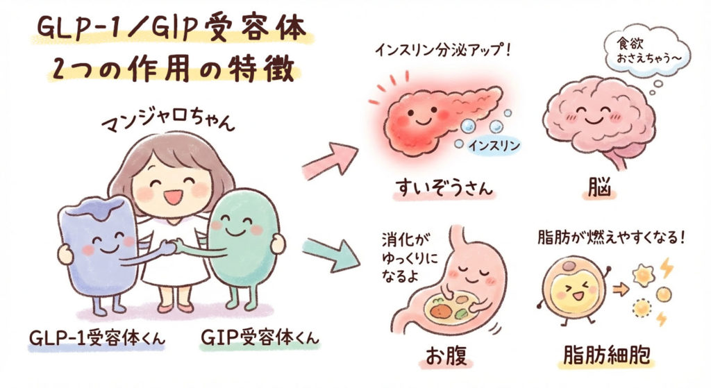 マンジャロは、GLP-1受容体作動薬とGIP受容体作動薬の2つの作用をあわせ持つ薬です。