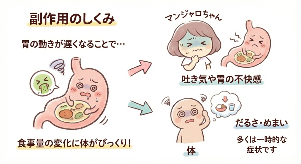 マンジャロの副作用の多くは、消化管への作用によって起こります。
