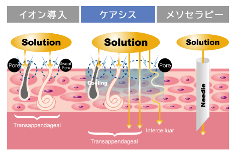 当院で採用しているケアシスは45℃から-20℃まで調節しながら、高濃度の薬剤を導入できる「クライオエレクトロポレーションシステム」を採用しています。皮膚に冷却を加える事で血管が収縮し、導入した薬剤が皮膚に長時間とどまるため、効果を持続させ更に発揮させることができます。